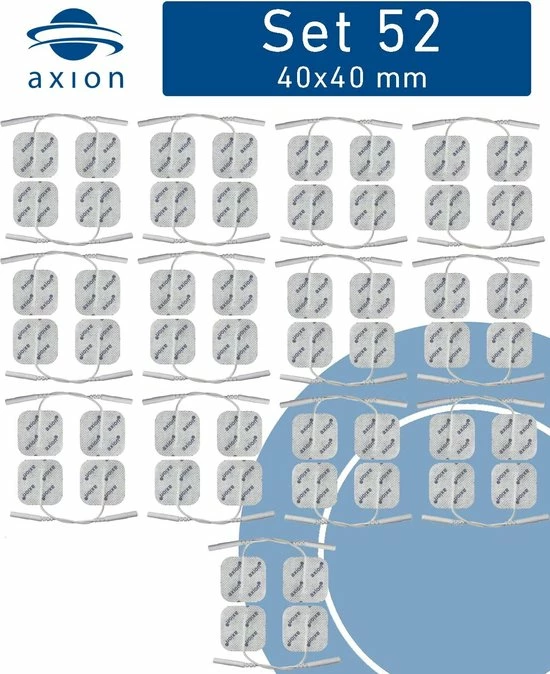Met deze 52 zelfklevende elektroden pads van de Duitse fabrikant Axion kan je aan de slag met je TENS-apparaat voor pijnverlichting of EMS-trainingsapparaat voor spierstimulatie. De kleefelektroden zijn herbruikbaar, duurzaam en multi-inzetbaar. Compatibel voor de volgende merken: Axion, Body-Clock, Dittmann, myStim, Pierenkemper, Promed, Prorelax, Saneo, schwa-medico, Stimio, TensCare, MedFit.