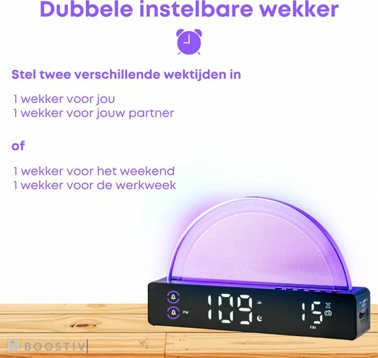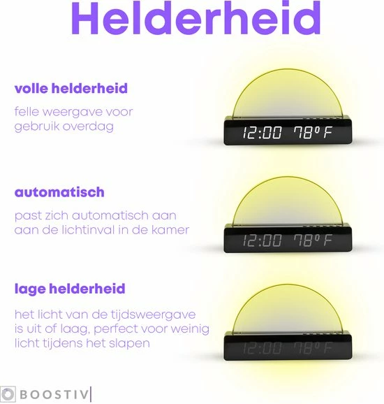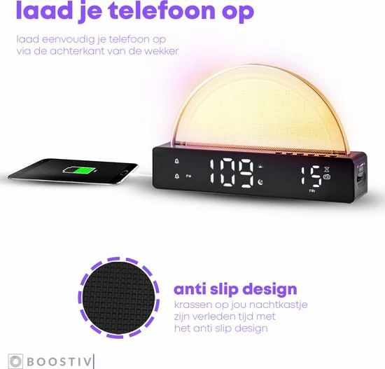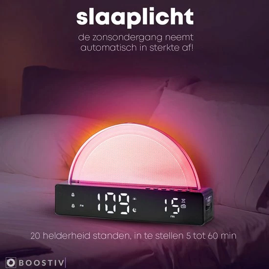 De wekker van Boostiv heeft een wake-up light functie. Wanneer je de wekker aan zet, zul je op een rustige wijze gewekt worden. De zonsopkomst start op het zwakste lichtniveau. Vervolgens zal geleidelijk de lichtsterkte toenemen, zodat je onbewust en comfortabel word gewekt! Dit is in te stellen van 5 tot 60 minuten voor het alarm.
