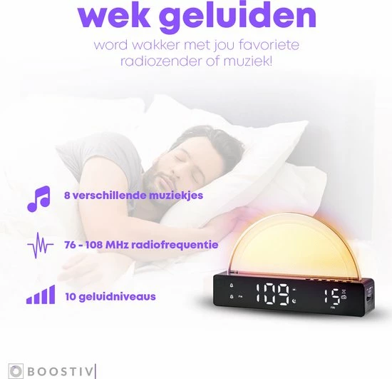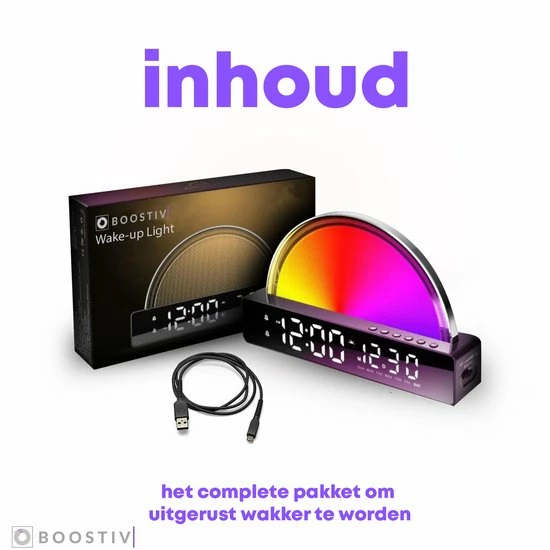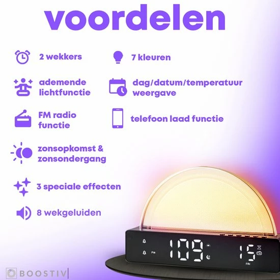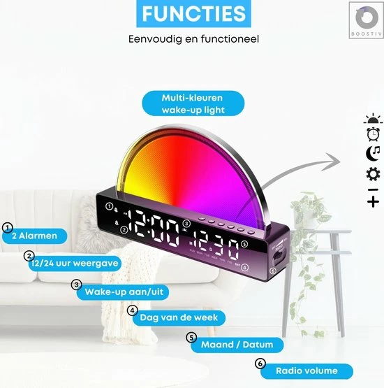 Stap jij ook altijd met het verkeerde been uit bed? Mis jij het uigerust wakker worden? Of kan jij niet in slaap komen? Met de alles-in-??n wekker van Boostiv is elke dag een feest! Met de uitstekende speaker, talloze licht kleurencombinaties, het moderne design en de wake-up light functie is elke dag eentje om van te genieten.