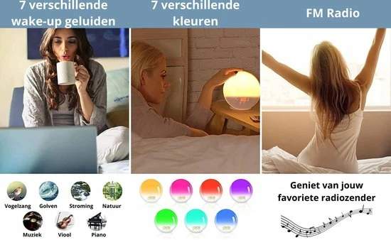 De Wake-Up Light van Lucky’s Products is naast FM-radio voorzien van 8 verschillende natuurgetrouwe omgevingsgeluiden, waarmee je geleidelijk en ontspannen ontwaakt. Wil je wakker worden of ontspannen met een natuurgetrouw geluid? Maak keuze uit de 8 verschillende omgevingsgeluiden en stel deze eenvoudig in. Zo kun je bijvoorbeeld ontwaken met het geluid van de zee of fluitende vogels.