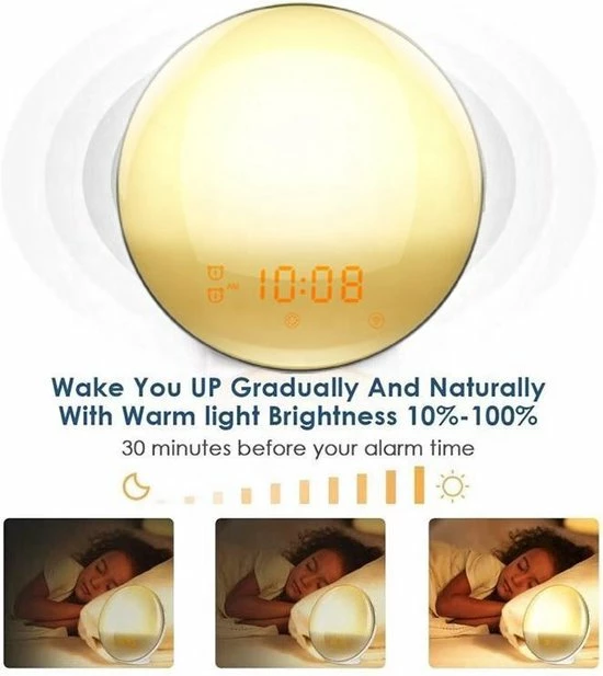 Licht heeft veel invloed op belangrijke processen in ons lichaam. Het heeft invloed op onze prestaties en het energieniveau. Door wakker te worden met de Wake-up Light wekker van Lucky’s Products ondersteun je het biologische dag- en nachtritme; je wordt op een natuurlijke manier wakker. Met de zonsopgangsimulatie word je gedurende 10 tot 60 minuten geleidelijk gewekt, waarbij de lichtintensiteit oploopt tot 100%. Hierdoor start je elke dag fit en vol energie!