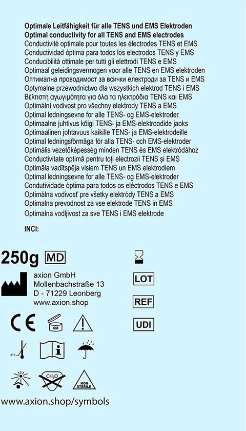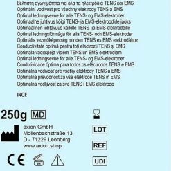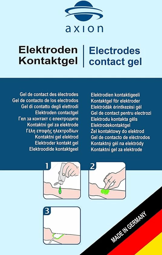 Met deze contactgel van de Duitse fabrikant axion verbeter je de geleding van gebruikte TENS-/EMS-elektroden. De huidvriendelijke, gelachtige consistentie is ideaal voor gebruik bij prikkelstroom-elektroden voor spier- of zenuwstimulatie, maar ook voor EEG en ECG. De gel voor elektrode-pads kan meerdere malen gebruikt worden.