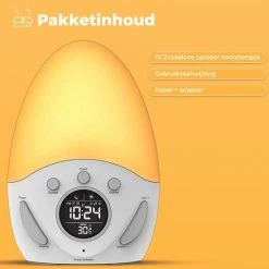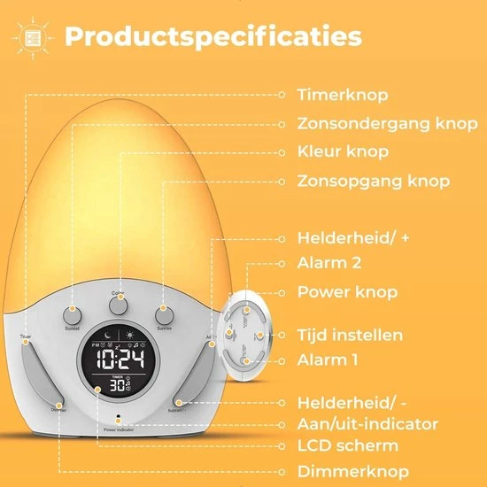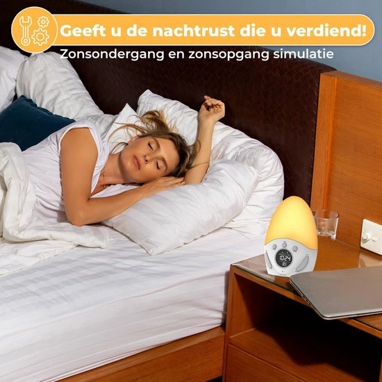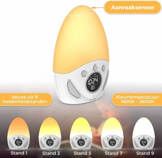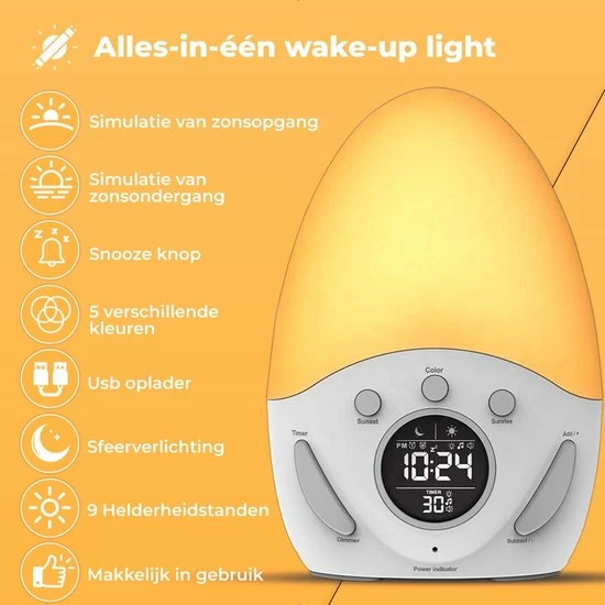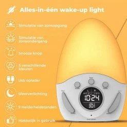 Door een slechte start van uw dag kan u zich namelijk vaak slaperig voelen en slecht functioneren. De wekker simuleert ‘s avonds een zonsondergang en vult de kamer ‘s ochtends weer met een zonsopkomst. Door de lichtintensiteit langzaam toe te laten nemen en te laten veranderen van kleur, wordt u op een geleidelijke manier wakker gemaakt. Hier heeft u de rest van de dag profijt van. Begin de dag beter dan ooit!
