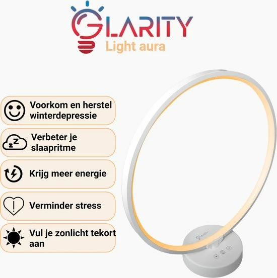 Moeheid, prikkelbaarheid, overdreven angstigheid, stress en concentratie zijn allemaal symptomen van winterblues en winterdepressie. De lamp van Glarity heeft een kracht van 10.000 lux. Hiermee probeert de lamp het licht van de zon na te bootsen. Door het nabootsen van het zonlicht, zal de winterdepressie en winterblues afnemen. De lichttherapielamp kan ook het slaapritme helpen herstellen, door de zonsopgang en ondergang na te bootsen.