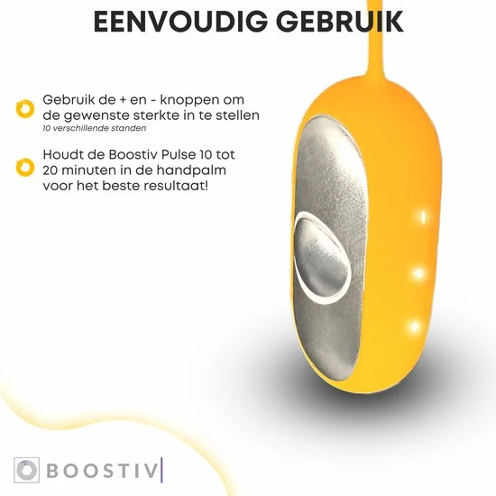 Het gevoel kan in het begin wennen zijn. Het apparaat stuurt immers lichten pulsen door het lichaam heen. Maar dit is alles behalve pijnlijk! Ook heeft het apparaat geen bijwerkingen en werkt het niet verslavend. Naar mate je het apparaat gebruikt, merk je dat een bepaalde frequentie sterkte het meest effectief is. Dit is verschillend voor elke gebruiker. Daarom is het eenvoudig om de Boostiv? Pulse in te stellen naar wens.