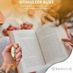 Wanneer je ongefocust bent, een moment van stress ervaart of geen energie hebt hou je de Boostiv? Pulse in de rechterhand. Deze hand staat in directe verbinding met de linkerhersenhelft via het centrale zenuwstelsel. Deze helft wordt gebruikt bij rekenen, taal, focus, logica en skills. De microfrequenties zorgen ervoor dat het gelukshormoon, oftewel Serotonine, vrijkomt in het lichaam. Serotonine verhoogt focus, verlaagt stress, laat een vredig gevoel bij je achter en het zorgt voor een fit en energiek gevoel. Ideaal tijdens het werken!