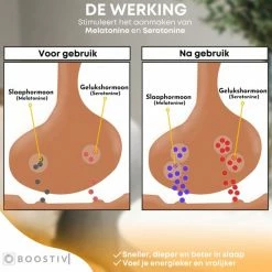 Wanneer je klaar bent om te gaan slapen houdt je de Boostiv Pulse? 10-20 minuten vast in de linkerhand. De linkerhand staat direct in verbinding met de rechterhersenhelft, deze helft zorgt voor emoties en het bewustzijn van het lichaam. De microfrequenties stromen via de linkerhand naar de rechter helft van het brein, door de speciale frequentiesnelheid geeft het brein een slaaphormoon vrij en wordt je lichaam slaperig. Niet alleen val je sneller in slaap maar ook de slaapkwaliteit is beter doordat er meer melatonine vrijgekomen is, hierdoor slaap je de hele nacht door!