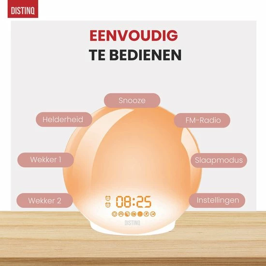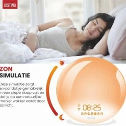 Licht heeft veel invloed op belangrijke processen in ons lichaam. Het be?nvloedt de onze prestaties en het energieniveau. Door te ontwaken met de DistinQ Wake-up Light wekker ondersteun je het biologische dag- en nachtritme; je wordt op een natuurlijke manier wakker. Met de zonsopgangsimulatie word je gedurende 10 tot 60 minuten geleidelijk gewekt, waarbij de lichtintensiteit oploopt tot 100%. Hierdoor start je dag fit en energiek!