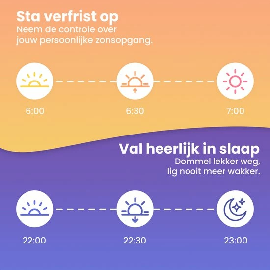 Een goed slaapritme hanteren, is een van de meest gezonde gewoontes die je kan hebben. Licht speelt daarbij een cruciale rol. Door de zonsopgangsimulatie wordt je lichaam geleidelijk aan wakker, en zijn er allerlei processen in je lichaam al van start gegaan op het moment dat jij zelf ontwaakt. Hierdoor voel jij je energieker en opgewekter.