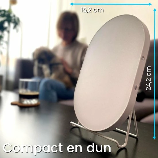 De Enlune daglichtlamp is compact en dun, om het je makkelijker te maken om in te schatten hoe groot deze lamp is hebben we in de afbeeldingen een telefoon ernaast gelegd. Zo krijg je heel makkelijk inzicht of deze lamp geschikt voor je is. De lamp past perfect op het bureau wat het ideaal in gebruik maakt. Wanneer je een tijdje bezig bent achter je laptop of boeken tijdens de winterperiode of gewoon ‘s nachts dan kun je de lamp praktisch inzetten om je bioritme een beetje te tricken om wat langer door te kunnen. Wanneer je de lamp s’ avonds gaat gebruiken vinden we je wel heel ambitieus maar pas er mee op! Het is heel belangrijk om je goed voor te bereiden voor een optimale nachtrust. We raden je aan om de lamp 2 uur voor het slapen gaan niet te gebruiken.