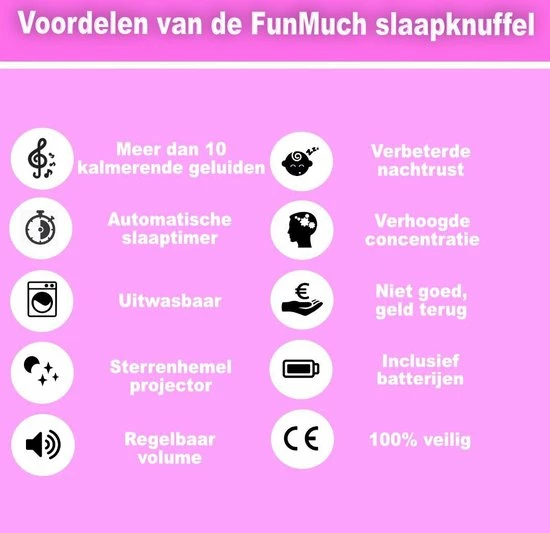 Geef je baby de nachtrust die ze verdienen met deze knuffel uil met slaapgeluiden, hartslaggeluid en nachtlampje. Het konijn beschikt over 10 slaapmuziekjes, 3 natuurlijke slaapgeluiden zoals hartslag- of watervalgeluid en een sterrenlicht projector. Kies het gewenste licht en geluid en uw baby zal heerlijk in slaap vallen. De knuffel schakelt zichzelf na een half uur uit als er geen nieuwe geluiden worden gekozen.