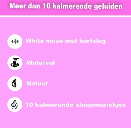White noise is een constante frequentie die bestaat uit een combinatie van alle mogelijke geluiden samen. Door plotselinge geluiden in de omgeving kan de rust van uw baby verstoord worden. Dankzij de white noise worden deze omgevingsgeluiden opgevangen in de frequentie van de white noise. Gecombineerd met het geluid van de hartslag die baby’s horen in de baarmoeder van de moeder zorgt dit voor een gevoel van rust en veiligheid, net zoals uw baby dat ervaart in de baarmoeder.