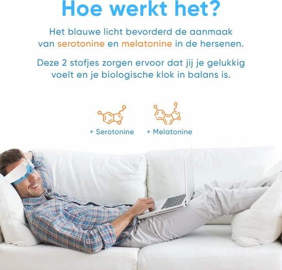 Voel je weer vrolijk ? het blauwe licht zorgt ervoor dat jouw hersenen extra serotonine aanmaken waardoor jij je opgewekt en vrolijk voelt.