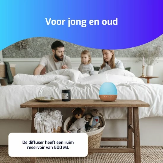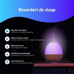 Om de slaapbeleving helemaal compleet te maken, gaat de White Noise-machine gepaard met zes verschillende, rustgevende lichtkleuren en een aroma diffuser. Die laatste functie maakt gebruik van ultrasone technologie om water te verstuiven en essenti?le oli?n te laten geuren. Het apparaat produceert een koele, vochtige en geurige mist die de slaapkwaliteit kan verbeteren.