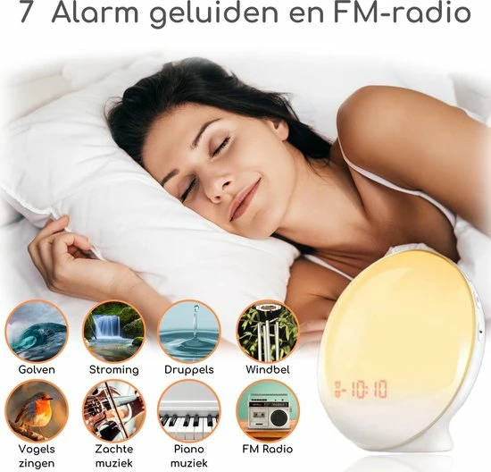 Deze slimme wekker is naast FM-radio voorzien van 7 rustgevende alarmgeluiden, waarin natuurgetrouwe omgevingsgeluiden worden gebruikt om jou te ontwaken uit een heerlijk diepe slaap.