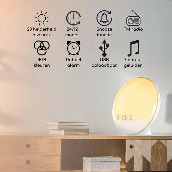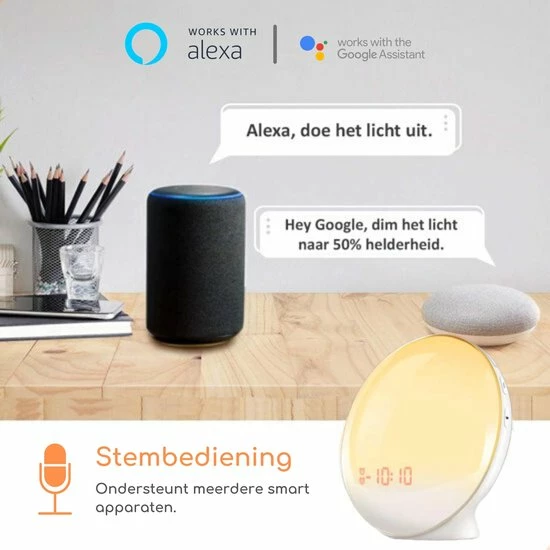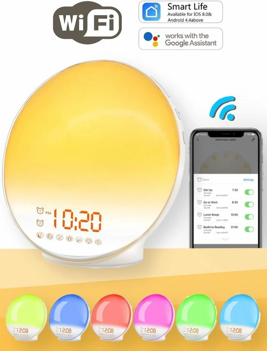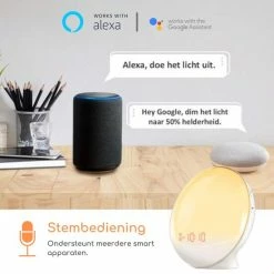 Ontspannen wakker worden bij natuurlijk licht, wie wil dat nou niet? Met 7 verschillende lichtkleuren, zonsopgangsimulatie, natuurlijke wekkergeluiden en voice control cre?er jij d? ideale wekker voor jou en stap jij nooit meer met het verkeerde been uit bed.