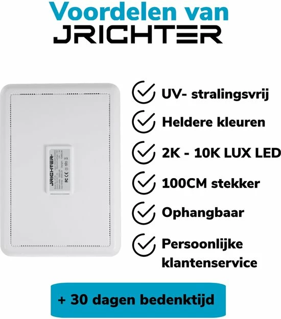 Te weinig daglicht kan erg slecht voor je zijn en heeft zelfs invloed op je gezondheid: je kunt je minder goed concentreren, minder energie hebben of slecht slapen. Dit wil je ten alle tijden voorkomen/genezen. Daarvoor bied deze therapie lamp van JRichter een uitkomst. Deze therapielamp compenseert het daglicht. Je kunt de lamp bijvoorbeeld bij het ontbijt of op het kantoor gebruiken. Je hebt verschillende lichtsoorten en sterktes die je erg gemakkelijk kan aanpassen zodat je het licht in kunt stellen hoe u het wilt.