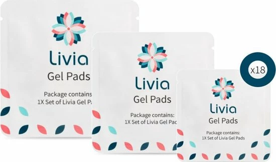 | Verpakkingsinhoud | Dit, pakket, bevat, 18, paar, Livia, Gel, Pads, (min., 18, maanden, werking) |