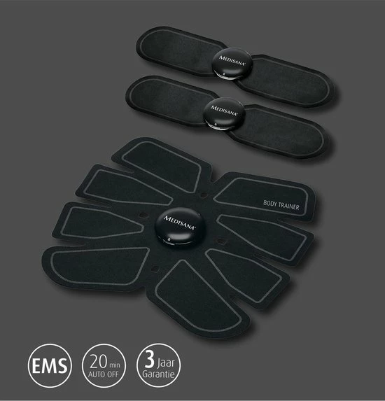De EMS body trainer wordt standaard geleverd met drie controllers met een pad voor de buik, twee pads voor de bovenarmen en –benen en batterijen.