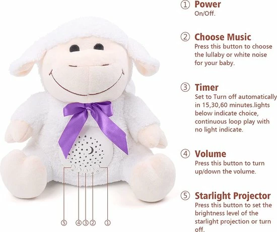 Een innovatie in grootte voor het slapen van baby’s. Het magische schaap verspreidt licht en rustgevende geluiden.Met de intelligente wijnsensor reageert de schaap de om de baby te kalmeren, kies het gewenste licht en geluid en uw baby zal heerlijk in slaap vallen.