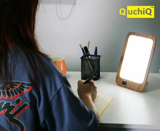De QuchiQ™ Daglichtlamp is compact en dun, om het je makkelijker te maken om in te schatten hoe groot deze lamp is hebben we in de afbeeldingen een telefoon ernaast gelegd. Zo krijg je heel makkelijk inzicht of deze lamp geschikt voor je is. De lamp past perfect op het bureau wat het ideaal in gebruik maakt. Wanneer je de lamp s’ avonds gaat gebruiken vinden we je wel heel ambitieus maar pas er mee op! Het is heel belangrijk om je goed voor te bereiden voor een optimale nachtrust.
