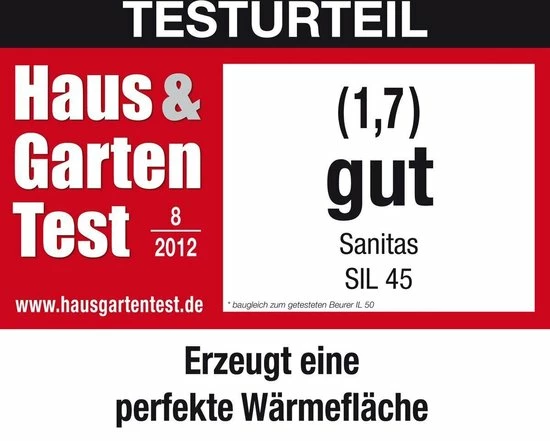 De Sanitas SIL 45 heeft een stralingsbereik van 30 tot 40 cm. Gebieden zoals uw schouder, elleboog, kuit en nek kunt u op die manier effectief behandelen. De lamp is eenvoudig op het te behandelen lichaamsdeel te richten dankzij de 35? draaibare voet voor comfortabel gebruik.. UV-straling wordt 100 procent door het keramische glas van de Sanitas SIL 45 tegen gehouden