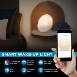 Heb je wel eens moeite met in slaap te komen? Of wil je meer ontspannen in slaapvallen? Wacht dan niet langer want de nieuwe Smart Life Wake-up Light is speciaal ontworpen om een gezonder slaapritme te cre?ren. Het natuurlijke licht van onze Wake-up Light wordt voor je wektijd geleidelijk sterker, waardoor je op een natuurlijke manier wakker wordt! Naast wakker worden helpt deze moderne Wake-up Light ook met in slaap vallen. Door de afname van het licht voelt het net alsof je elke dag onder de zonsondergang in slaap valt! Met een handige app kun je hem geheel instellen naar uw wensen.