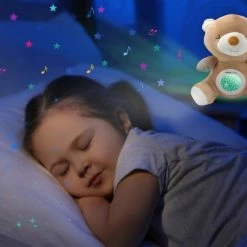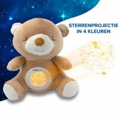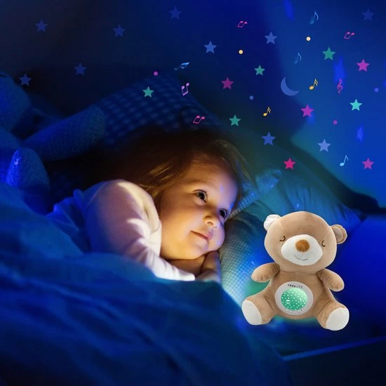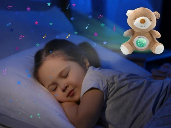 De Beer bevat 12 verschillende slaapmuziekjes, 4 natuurlijke slaapgeluiden (hartslag, waterval en natuur) en een sterrenprojector met verschillende kleuren. Er kan gekozen worden uit 3 volume standen. De geluiden en sterrenprojector zorgen gevoel van rust en veiligheid, net zoals baby?s ervaren in de baarmoeder. Er zijn drie in te stellen volume standen.