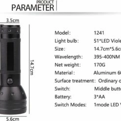 Krachtige UV zaklamp met maar liefst 51 LED’s. De LED’s producten UV licht met een ‘wavelength’ van 395 tot 400NM. De zaklamp werkt op 3x AA batterij (niet meegeleverd).