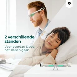 De bril heeft 2 verschillende standen. 1 stand voor overdag en 1 stand voor in de avond. De stand voor overdag kun je gebruiken om je dag een kickstart aan energie te geven en de stand voor in de avond kun je gebruiken om te zorgen dat je eerder in slaap zult vallen.