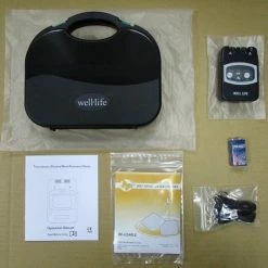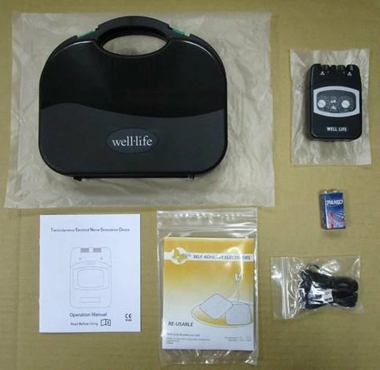 De Well-Life TENS wordt compleet geleverd met koffertje, elektroden, kabeltjes, batterij en gebruiksaanwijzing met advies voor het plaatsen van elektroden.