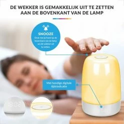 De wekker is uit te zetten door met je hand op de bovenkant van de wake up light te drukken. Indien dit niet gedaan wordt, zal de snooze-modus starten en hoor je na 5 minuten het alarm nog een keer.
