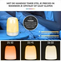 Veel mensen hebben moeite om in slaap te komen. Met deze wake up light is het mogelijk om beter in slaap te komen middels een timer. Deze timer werkt als volgt: Je kunt een timer van 10, 30 of 60 minuten aanzetten op het apparaat. Het licht zal bij het aanzetten van de timer beginnen op een helder niveau, naarmate de tijd vordert zal het licht geleidelijk minder helder worden en uitgaan.