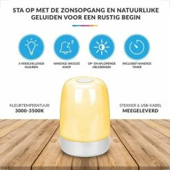 De wake up light is ontworpen om een gezonder slaapritme te cre?ren zowel voor het na bed gaan als het opstaan in de ochtend. Een half uur voordat je wekker afgaat zal het licht geleidelijk sterker worden, waarbij de lichtintensiteit oploopt tot 100%. Verder kun je ook voor het slapen een timer instellen, waardoor jij op een natuurlijke wijze in slaap zal komen.