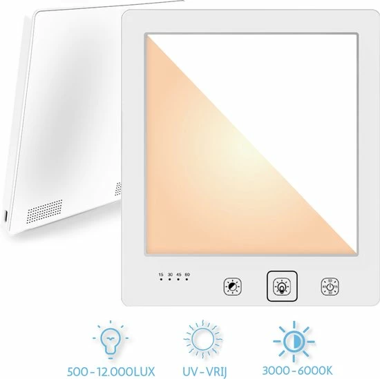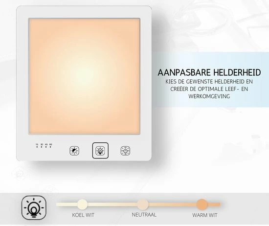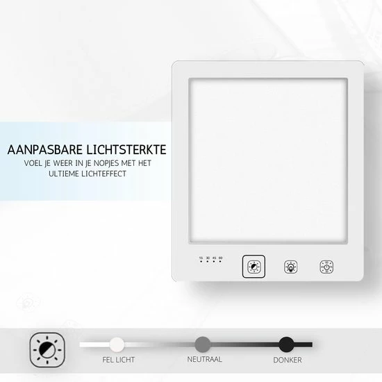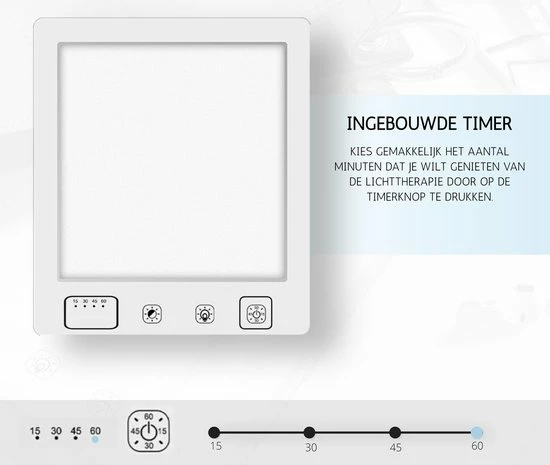 De lamp heeft drie lichtstanden, zo kun je in het begin wennen aan het licht en dit langzaam opbouwen. De lamp kun je aan en uit zetten met de schakelaar aan de zijkant. De lichtsterkte, tijdsduur en helderheid zijn in te stellen met de touchbuttons op de voorkant.